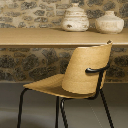El nombre de esta silla revela el núcleo del proyecto. De hecho, es precisamente en el soporte en forma de T del respaldo donde se ha centrado la atención. En la raíz del concepto, está claramente la recuperación de un estilo clásico, propio del diseño de los años 50 y 60. Las dos madera unidas por la estructura metálica son una imagen que cada uno de nosotros tiene en su memoria, desde ejemplos cotidianos como sillas escolares o sillas de bistró nórdico hasta obras maestras inmortales de Eames.